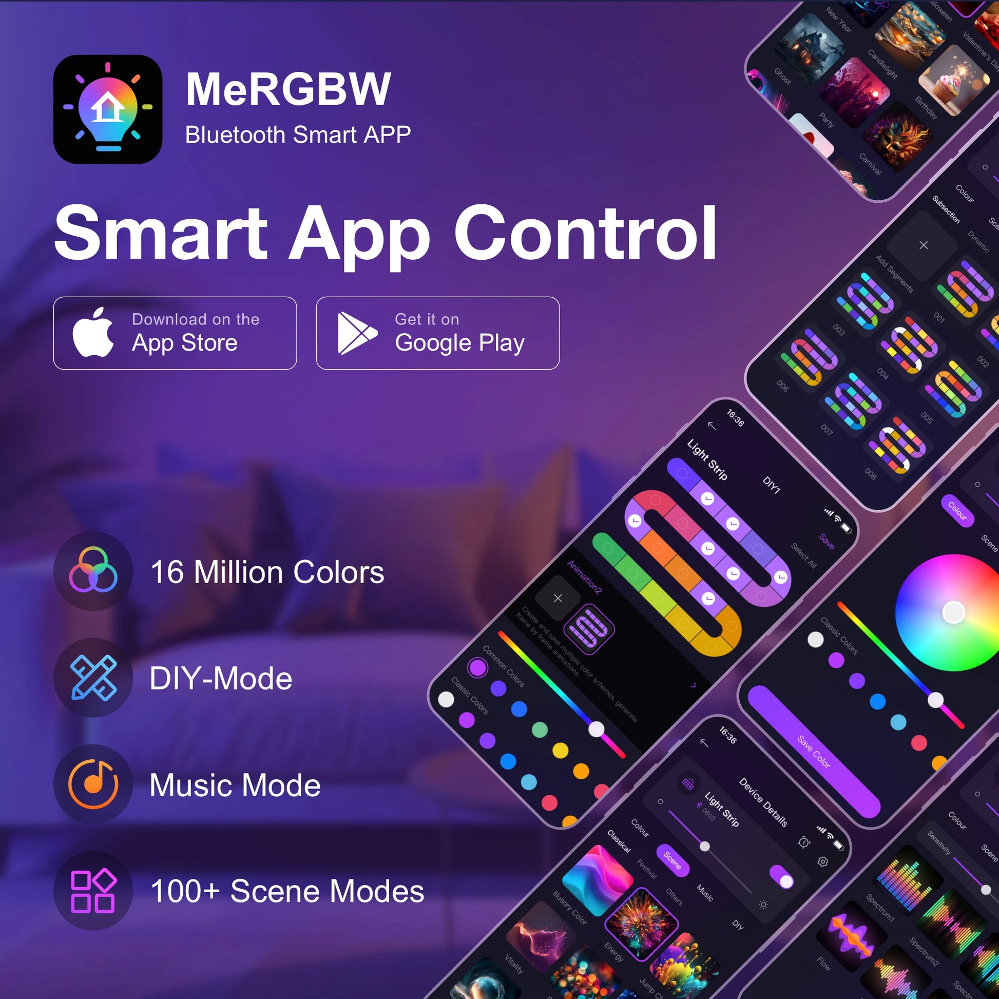 Special Feature: Dimmable,auto on/off,can be recycled,Timer setting, Smart APP & Remote control,Music sync,200 modes & 16 Million colors,DIY custom room decoration,Portable, Adjustable Color Temperature, Foldable, Color Changing